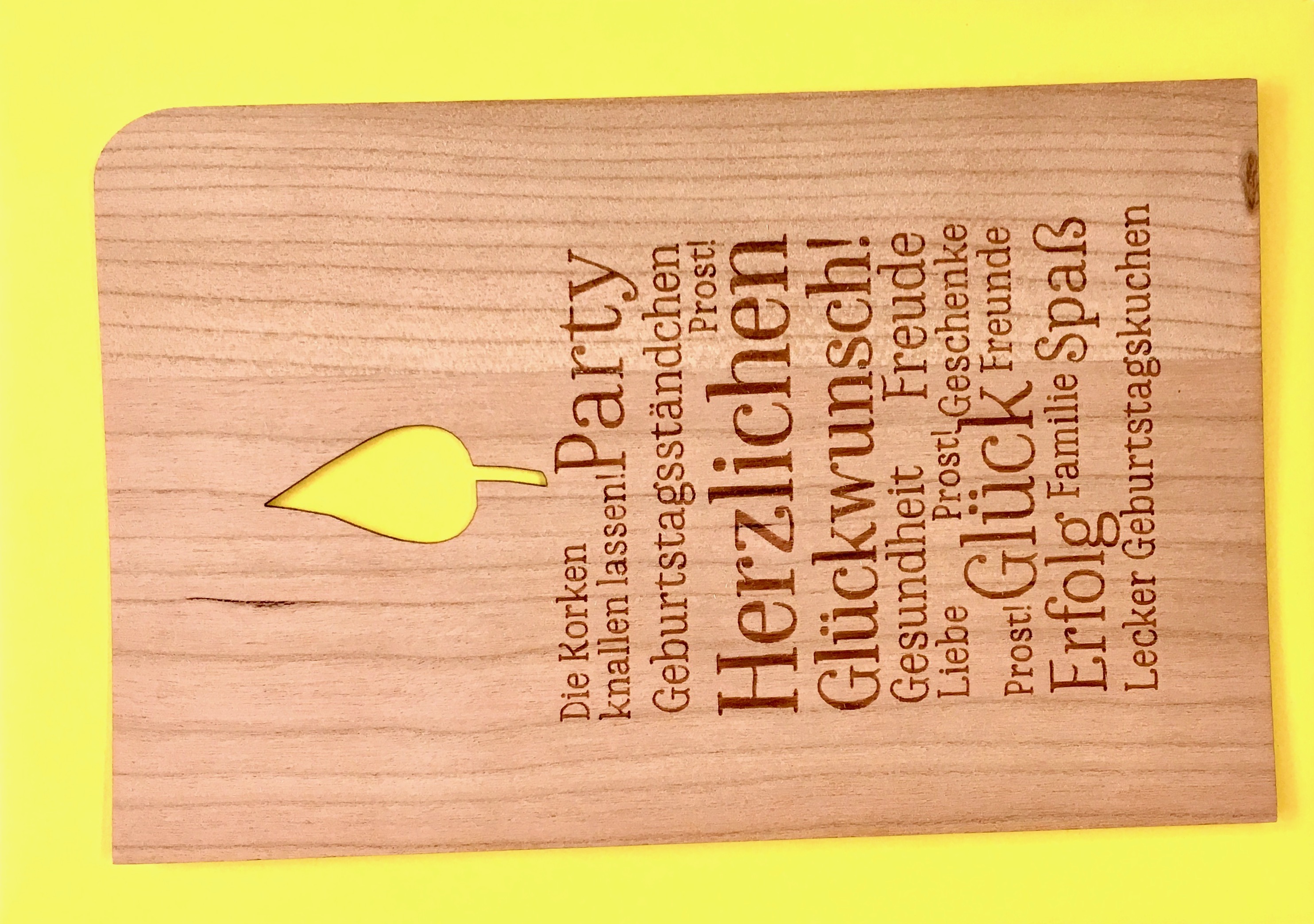 Grußkarte aus echtem Kirschbaumholz 14x9cm inkl. DIN C6 Umschlag! "Party Glück Erfolg Spass - Herzlichen Glückwunsch"