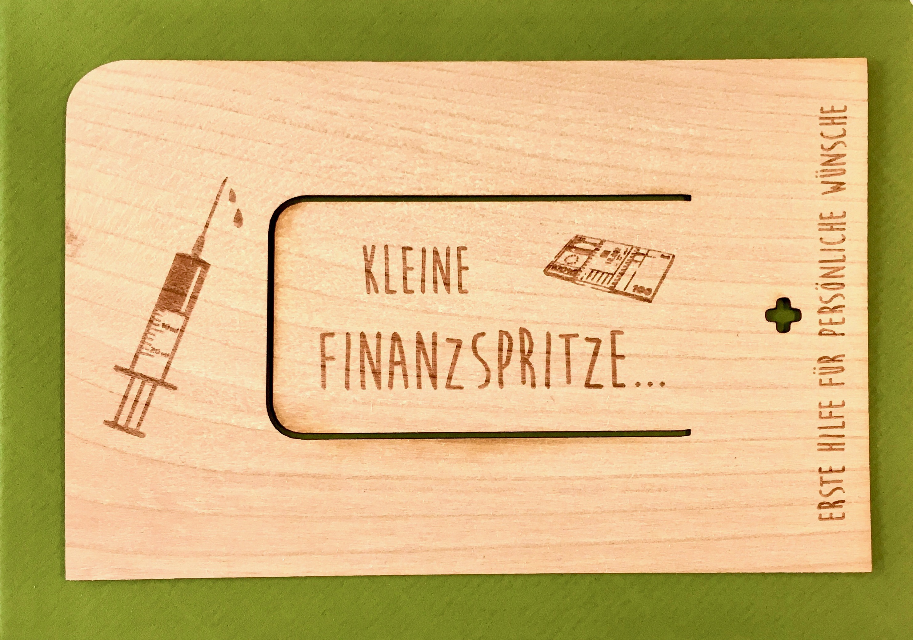 Grußkarte aus echtem Kirschbaumholz 14x9cm inkl. DIN C6 Umschlag! "kleine Finanzspritze... Erste Hilfe für persönliche Wünsche"