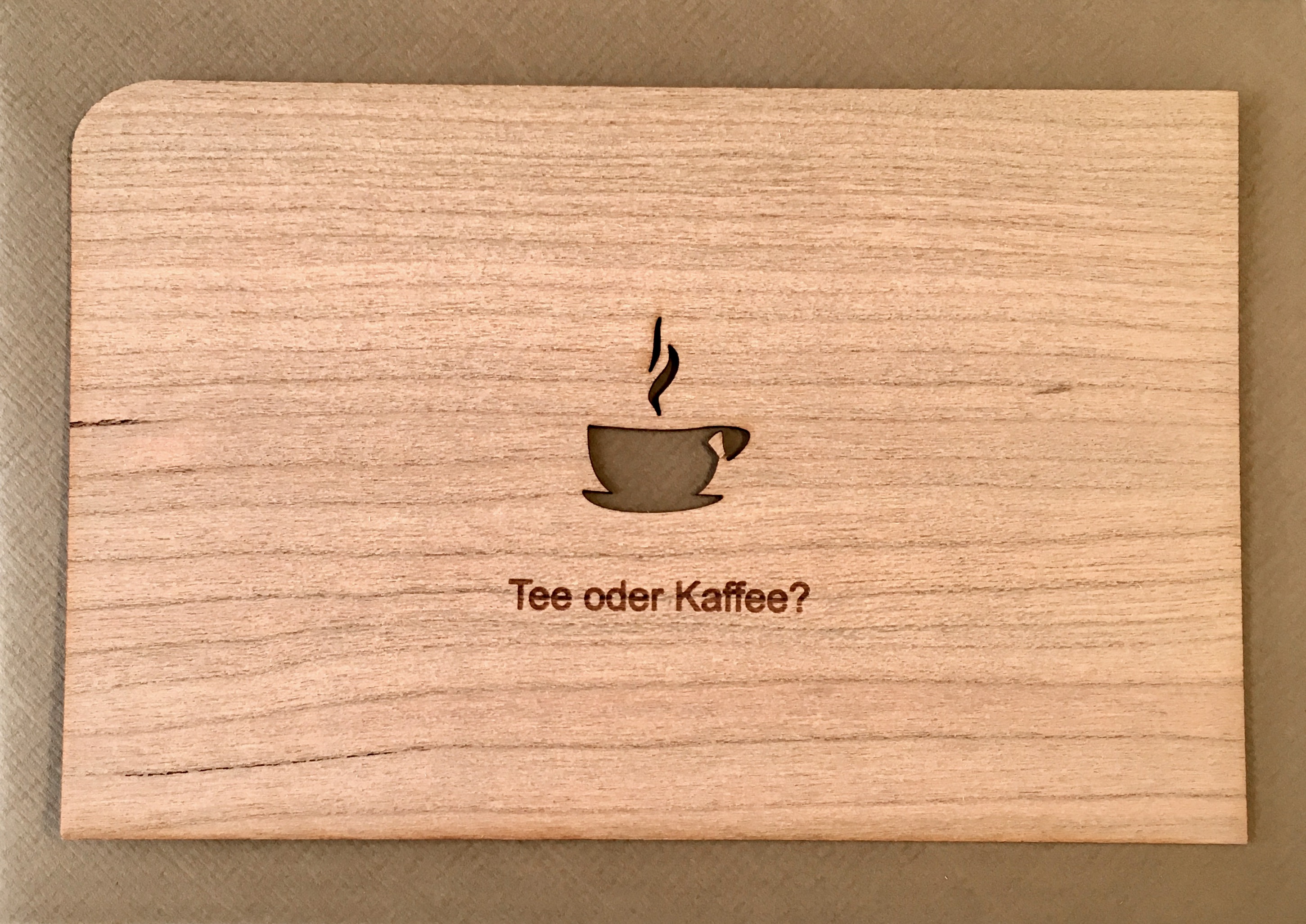 Grußkarte aus bestem ca. 1mm Kirschbaumholz Größe: 14x9cm inkl. DIN C6 Umschlag! "Tee oder Kaffee?" EAN: 4260327940021