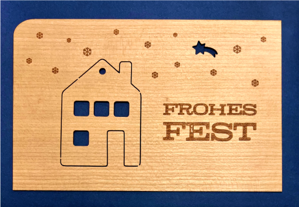 Grußkarte aus bestem ca. 1mm Kirschbaumholz Größe: 14x9cm inkl. DIN C6 Umschlag! "Frohes Fest" EAN: 4260327940021 *Für den Versand mit der Post, einfach als Standard Brief (bis 20g) frankieren!