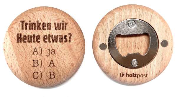 Flaschenöffner aus Buche "Trinken wir Heute etwas? A) ja B) A C) B" geölt + graviert, mit 2 Magneten auf der Rückseite, Rund d= 6,5cm