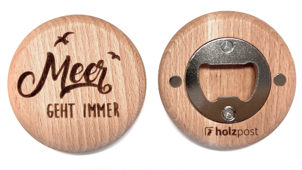 Flaschenöffner aus Buche "Meer geht immer" geölt + graviert, mit 2 Magneten auf der Rückseite, Rund d= 6,5cm