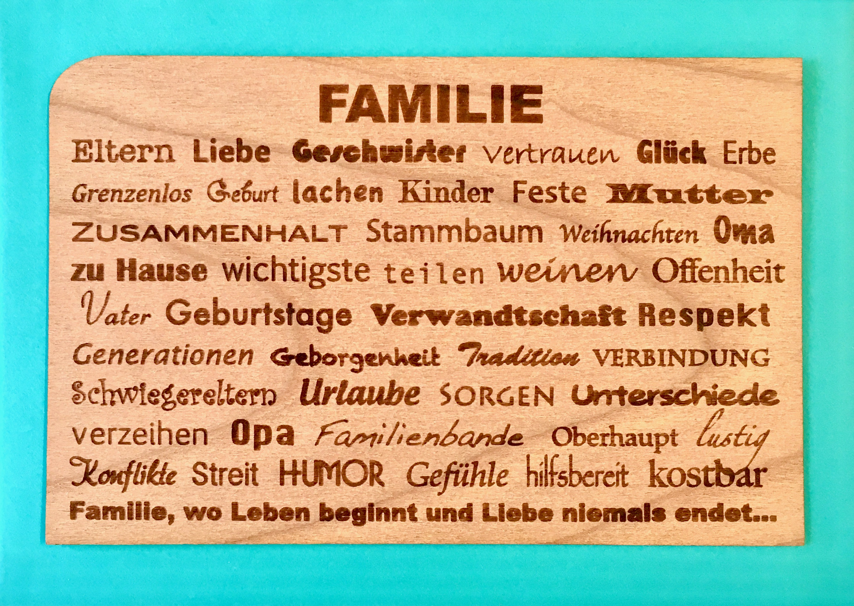 Grußkarte aus echtem Kirschbaumholz 14x9cm inkl. DIN C6 Umschlag! "Familie"