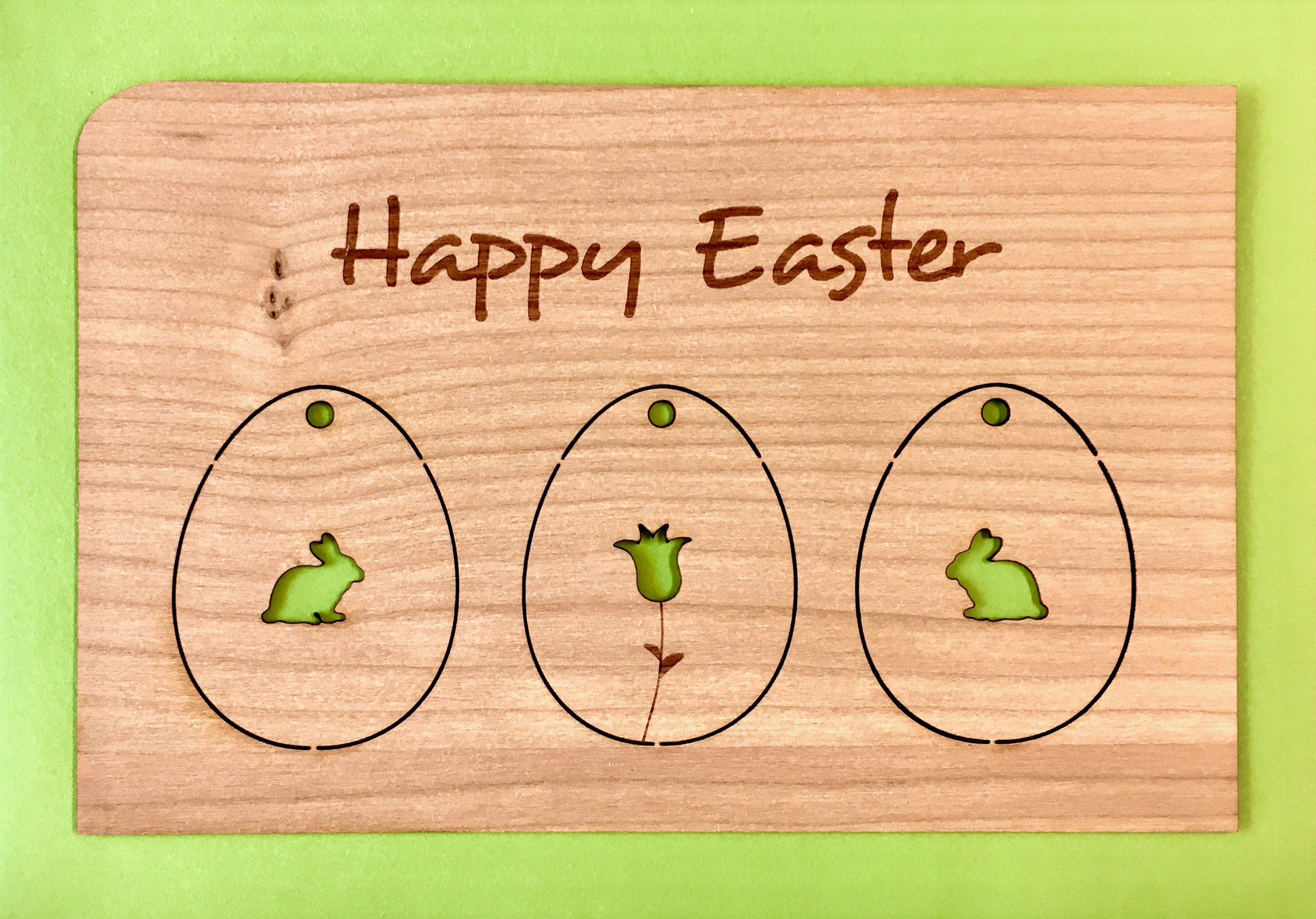 Grußkarte aus echtem Kirschbaumholz 14x9cm inkl. DIN C6 Umschlag! Mit Ostereiern zum Rausdrücken "Happy Easter"